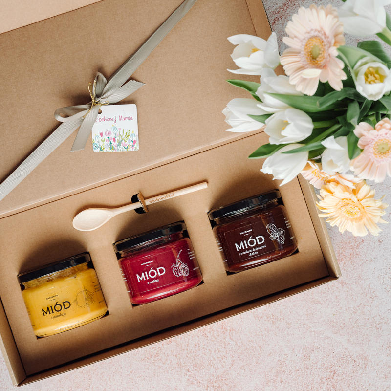 Zestaw 3 średnich miodów smakowych 350g w eleganckim kartoniku kraft z dołączoną wstążką i etykietką do wyboru.