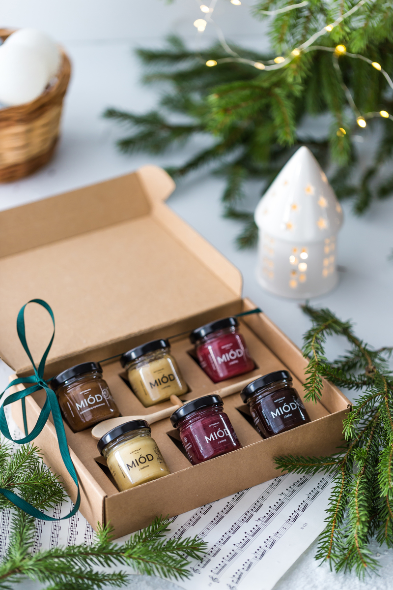 Zestaw 6 mini miodków zapakowany w kartonik z etykietką do wyboru zawiera: