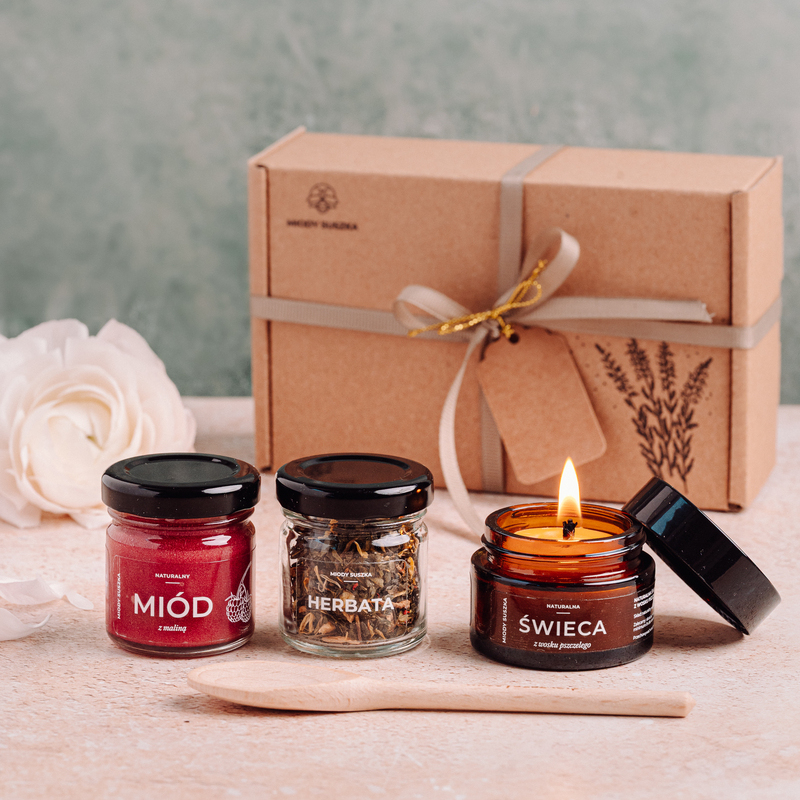 Zestaw relaksujący ze świeczką, miodkiem i herbatą w mini wersji.
