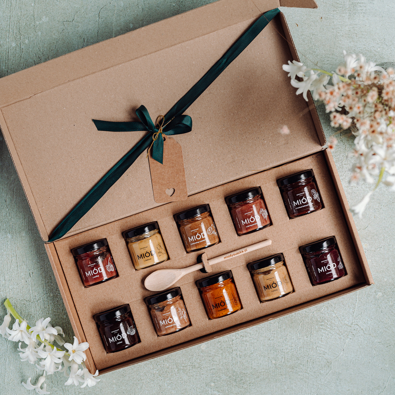 Zestaw Bogactwo smaków to nasza propozycja mini miodków zapakowanych w elegancki kartonik. Idealna propozycja na Dzień Mamy, Dzień Taty z dołączoną etykietką do wyboru Kochanej Mamie/Kochanemu Tacie.