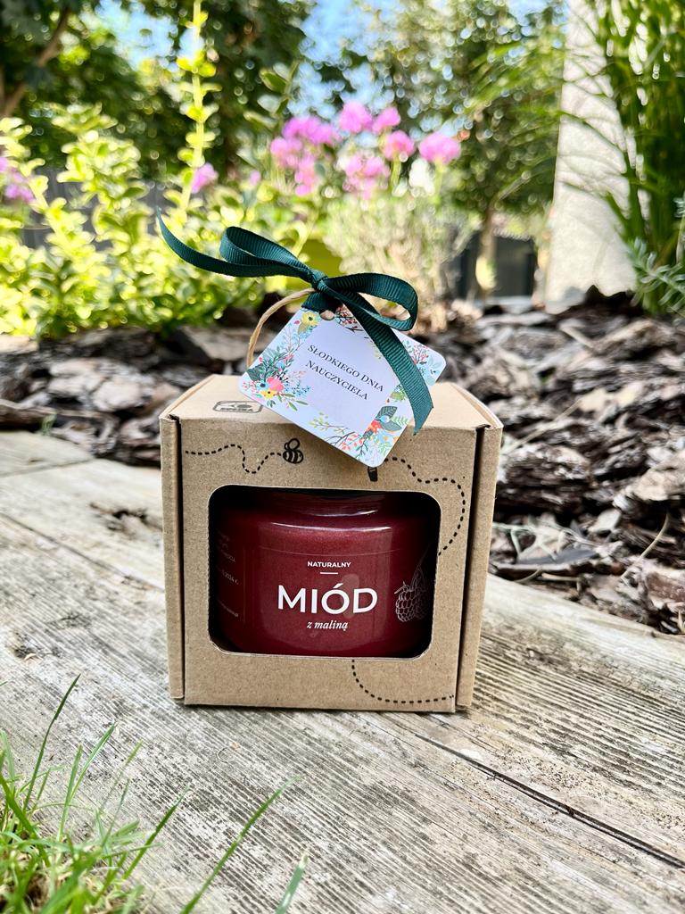 Zestaw 1 miód smakowy 350g w ozdobnym eko kartoniku z etykietką Słodkiego dnia nauczyciela.