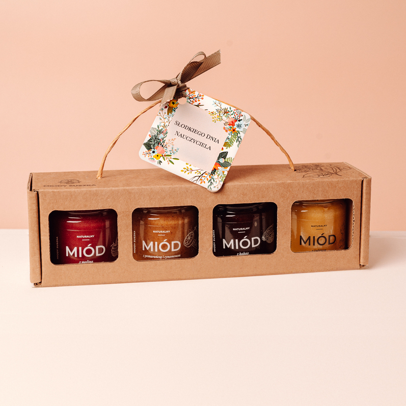 Zestaw 4 miodków smakowych 4x40g w ozdobnym eko kartoniku z etykietką Słodkiego dnia nauczyciela.