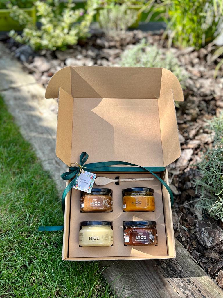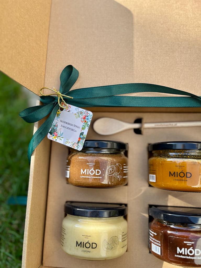 Zestaw prezentowy w eleganckim kartoniku z naszymi najlepszymi propozycjami miodów smakowych z etykietką Słodkiego Dnia Nauczyciela.