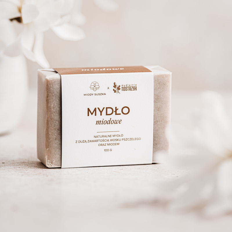 Bazą mydła miodowego są oleje roślinne skomponowane ze sobą tak, by uzyskać jak najlepsze właściwości pielęgnacyjne. Swój szczególny charakter kostka otrzymuje dzięki dodaniu do niej kluczowych składników: miodu i wosku pszczelego. Miód to bogactwo witamin, które chronią skórę przed wolnymi rodnikami, odżywiają ją i witalizują. Dodatkowo miód wspomaga usuwanie martwych komórek złuszczonego naskórka oraz wspiera zdolności oczyszczania, zaś dzięki zawartości cukrów działa nawilżająco. Wosk pszczeli tworzy na skórze warstwę ochronną, zabezpieczając ją przed utratą wody. To idealne rozwiązania dla wszystkich tych, którzy poszukują nawilżenia, ochrony i odżywienia. Mydło w kostce posiada, tzw. przetłuszczenie – celowo nie zmydliliśmy części z użytych tłuszczów, by mogły działać na Twoją skórę jak ochronny balsam.