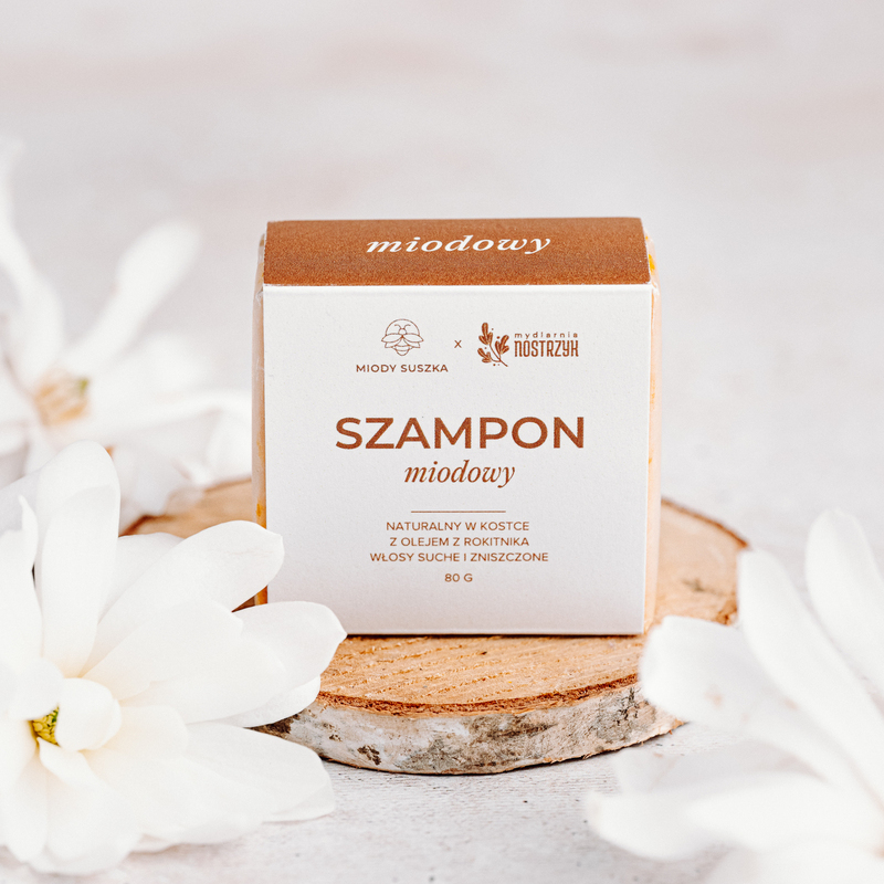 SZAMPON miodowy w kostce o zapachu miodu i wanilii, wzbogacony odżywczym olejem z rokitnika.