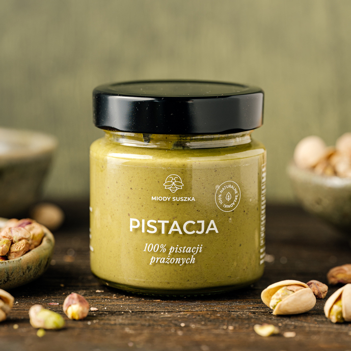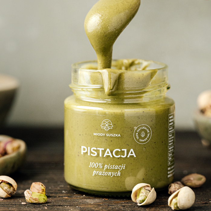 Pistacja 100% to naturalny krem stworzony wyłącznie z prażonych orzechów pistacjowych – bez dodatku soli, cukru, oleju palmowego czy konserwantów.