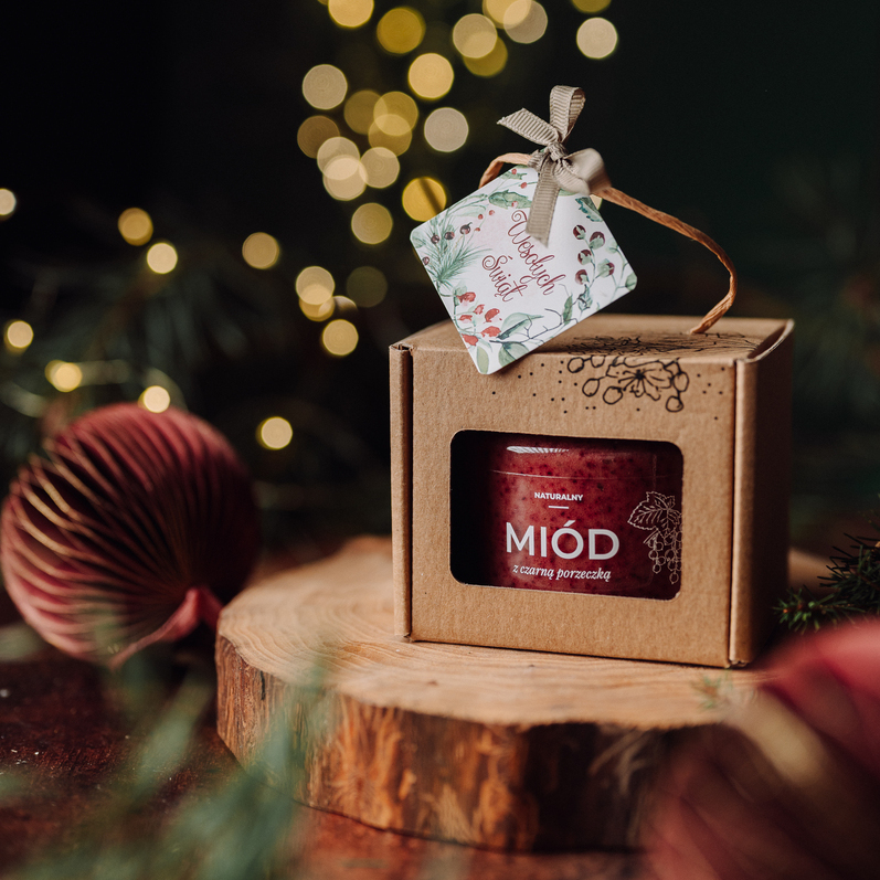 Świąteczny zestaw 1 miód smakowy 350g w ozdobnym eko kartoniku z etykietką świąteczną i łyżeczką.