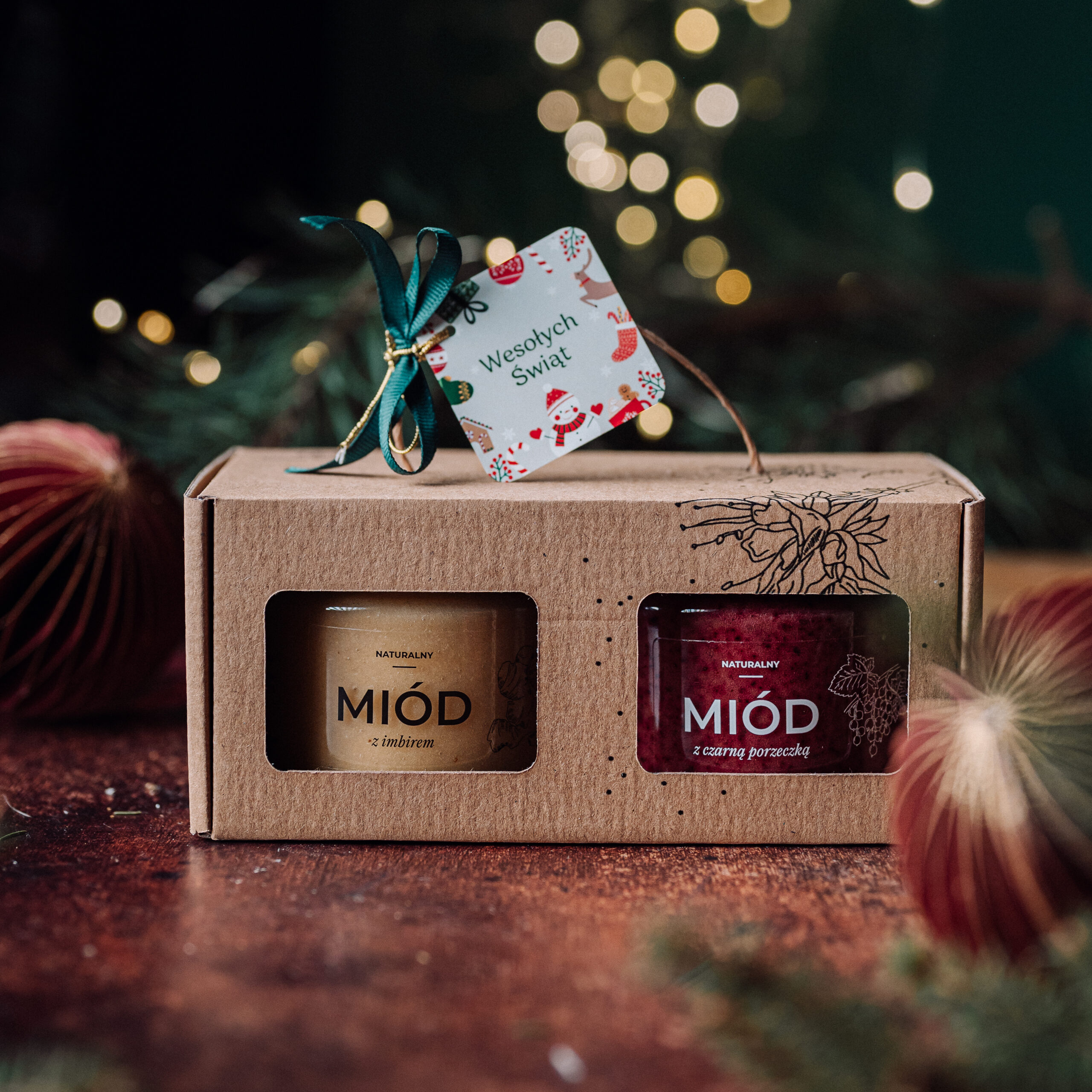 Zestaw 2 miodów smakowych 2x350g w ozdobnym kartoniku z etykietką świąteczną.