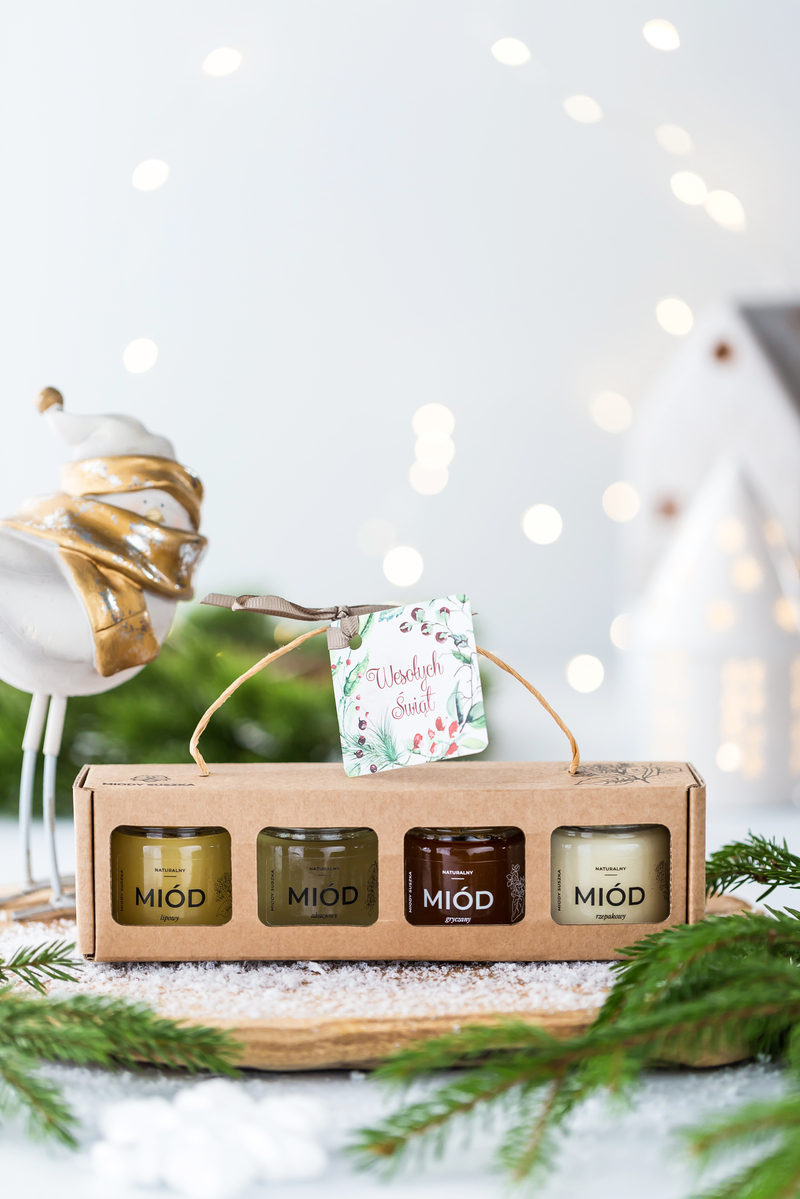 Zestaw 4 miodków tradycyjnych 4x40g w ozdobnym eko kartoniku z etykietką świąteczną.