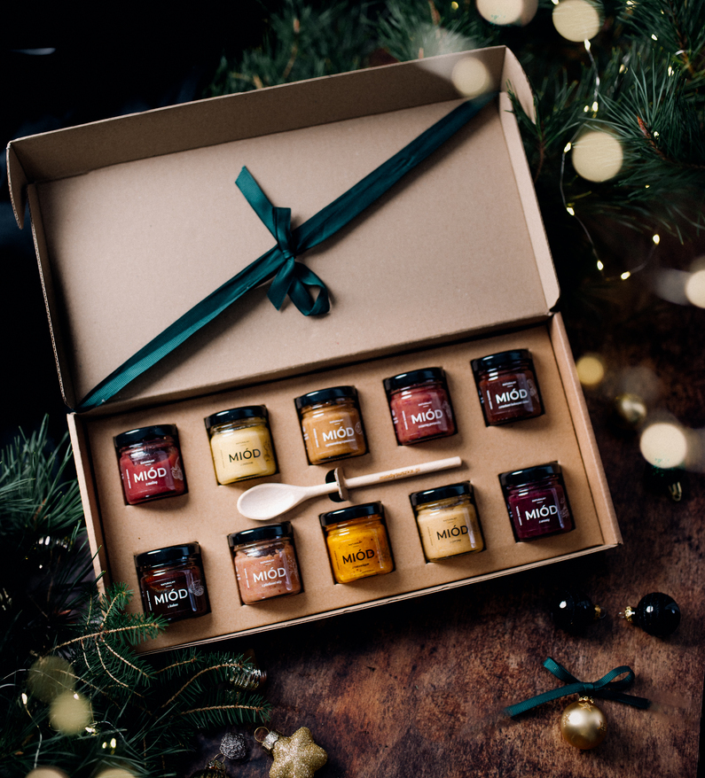 Zestaw mini miodków zapakowany w elegancki kartonik zawiera: