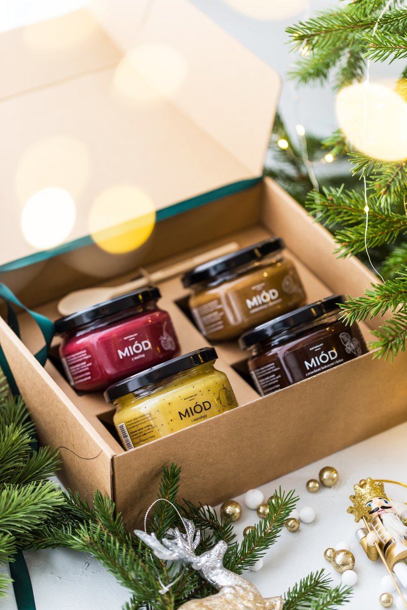 Świąteczny zestaw prezentowy w eleganckim kartoniku z czterema wybranymi miodami smakowymi z etykietką świąteczną.