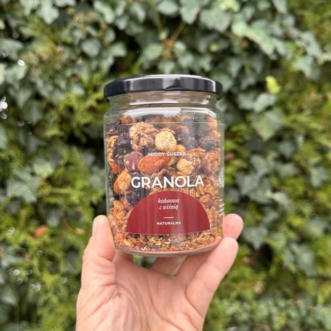 Granola kakaowa z wiśnią to wyjątkowe połączenie naturalnej słodyczy miodu pszczelego, aromatycznego kakao i kwaskowatości suszonej wiśni. Każdy kęs to chrupiąca mieszanka ekologicznych płatków owsianych, orzechów i czekolady – idealna dla miłośników zdrowych, a zarazem intensywnie czekoladowych smaków.