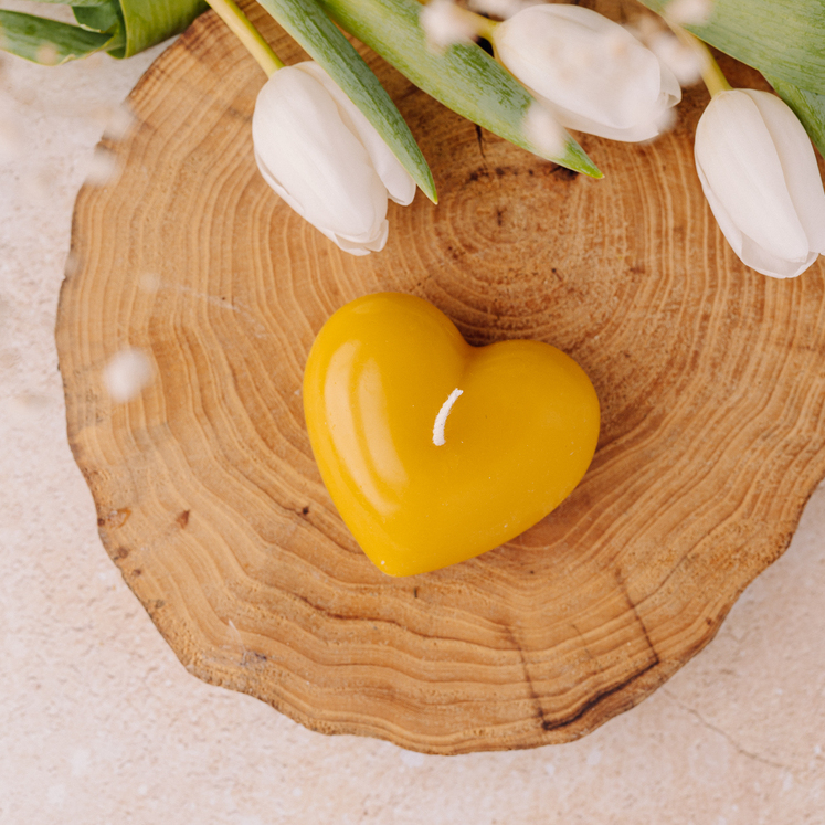 Świeca z wosku pszczelego o kształcie serca.