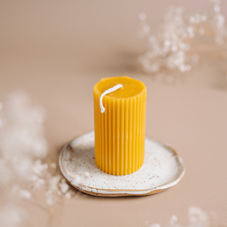Świeca z wosku pszczelego o kształcie walca.