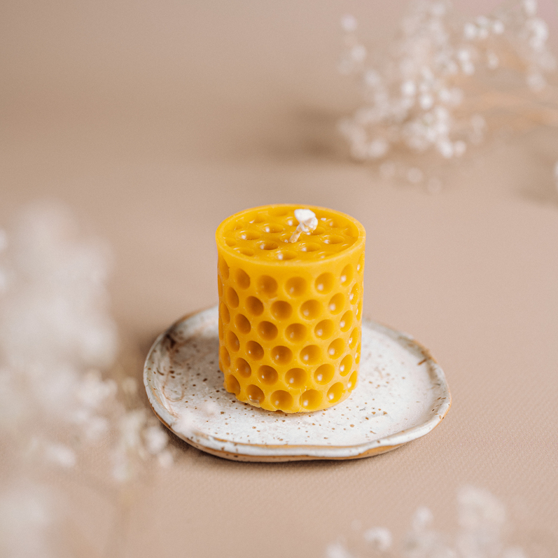 Świeca z wosku pszczelego o kształcie walca.