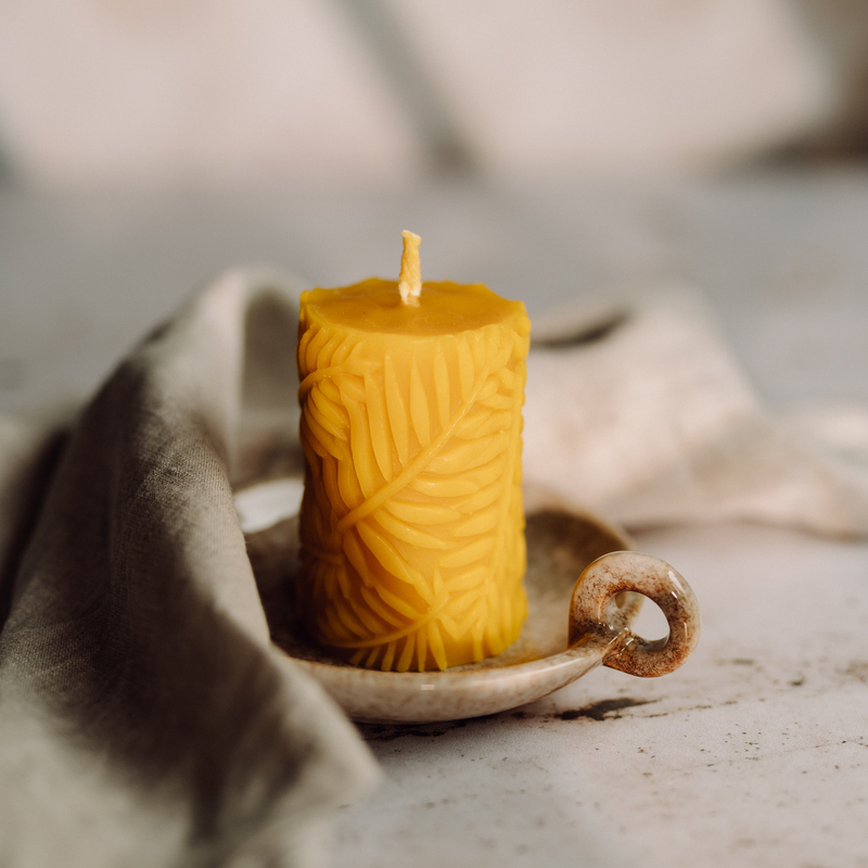 Świeca z wosku pszczelego o kształcie walca.