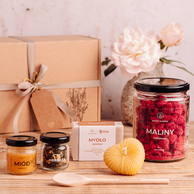 świecę z naturalnego wosku pszczelego, roztaczającą romantyczny blask i miodowy zapach.